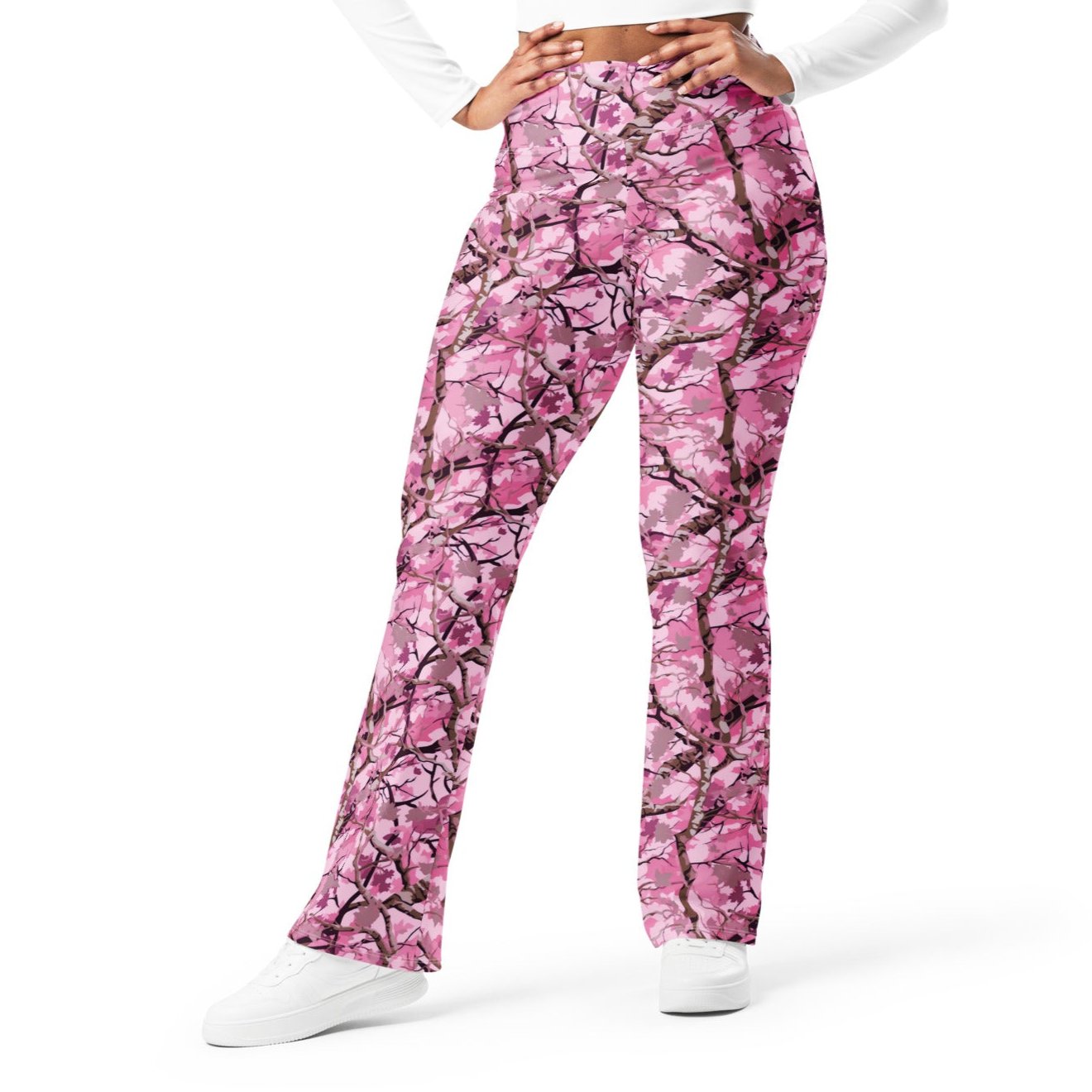 Designed to enhance your figure, these trendy leggings feature a high waist and a butt-lifting cut. The flared leg bottoms add a touch of style and make the leggings comfortable. Wear them on a walk, to the gym, or style them up with a bomber jacket or hoodie.