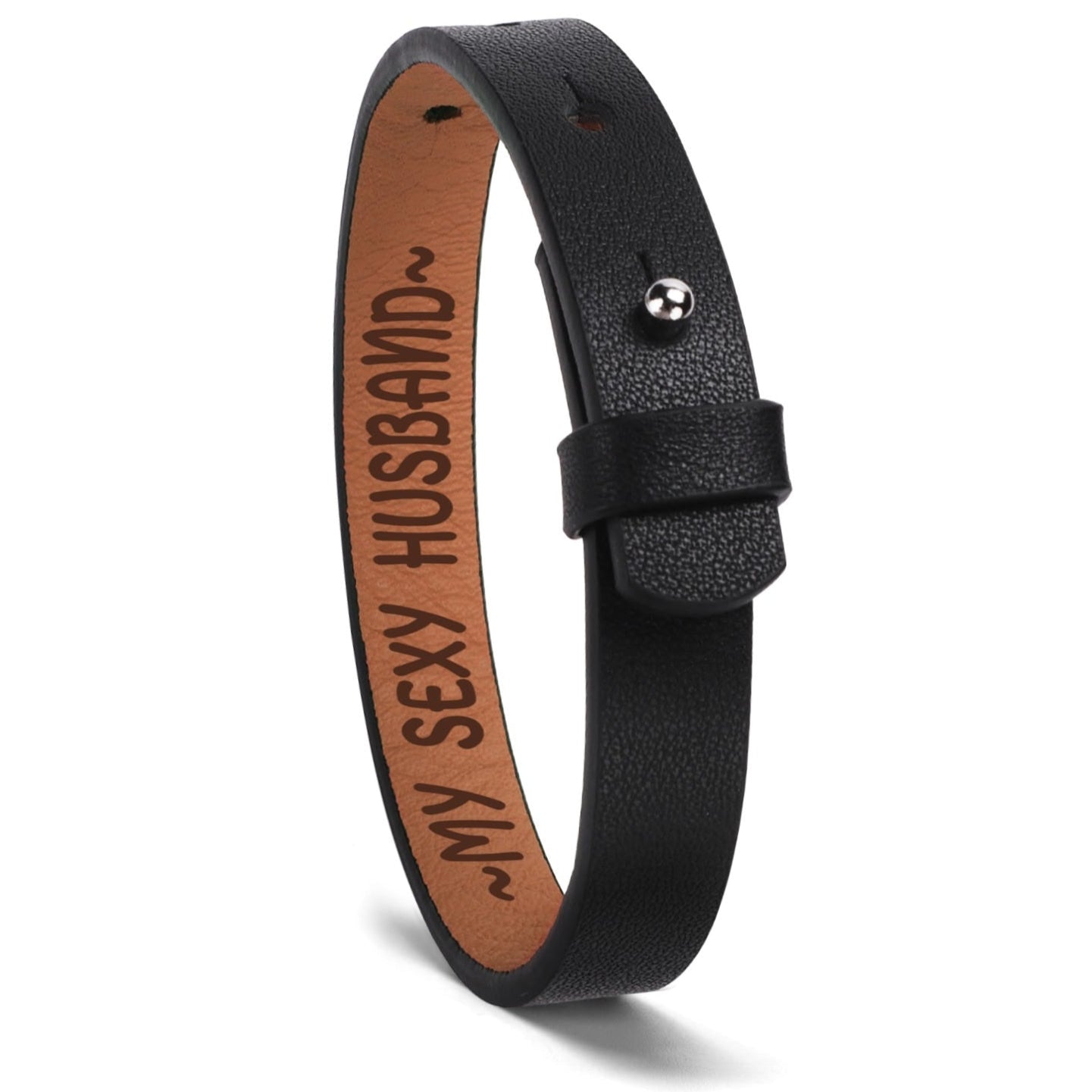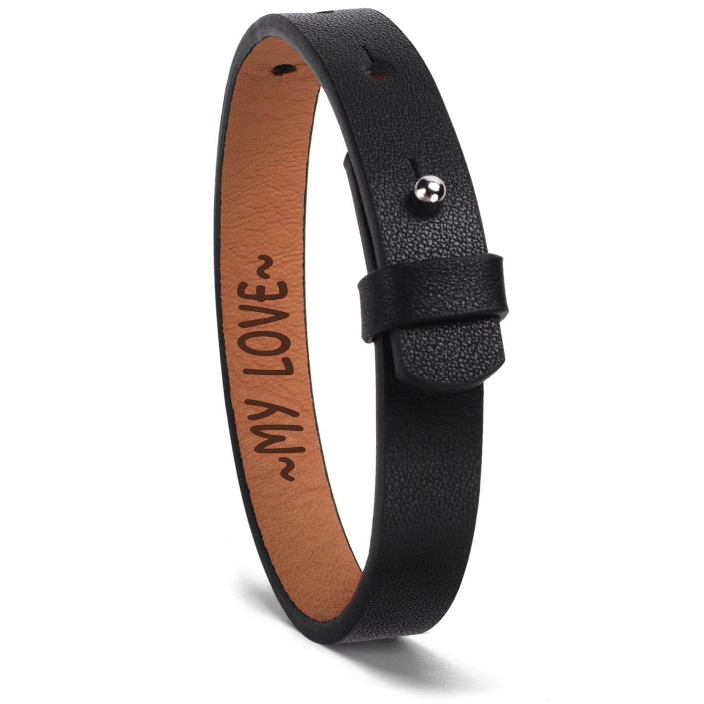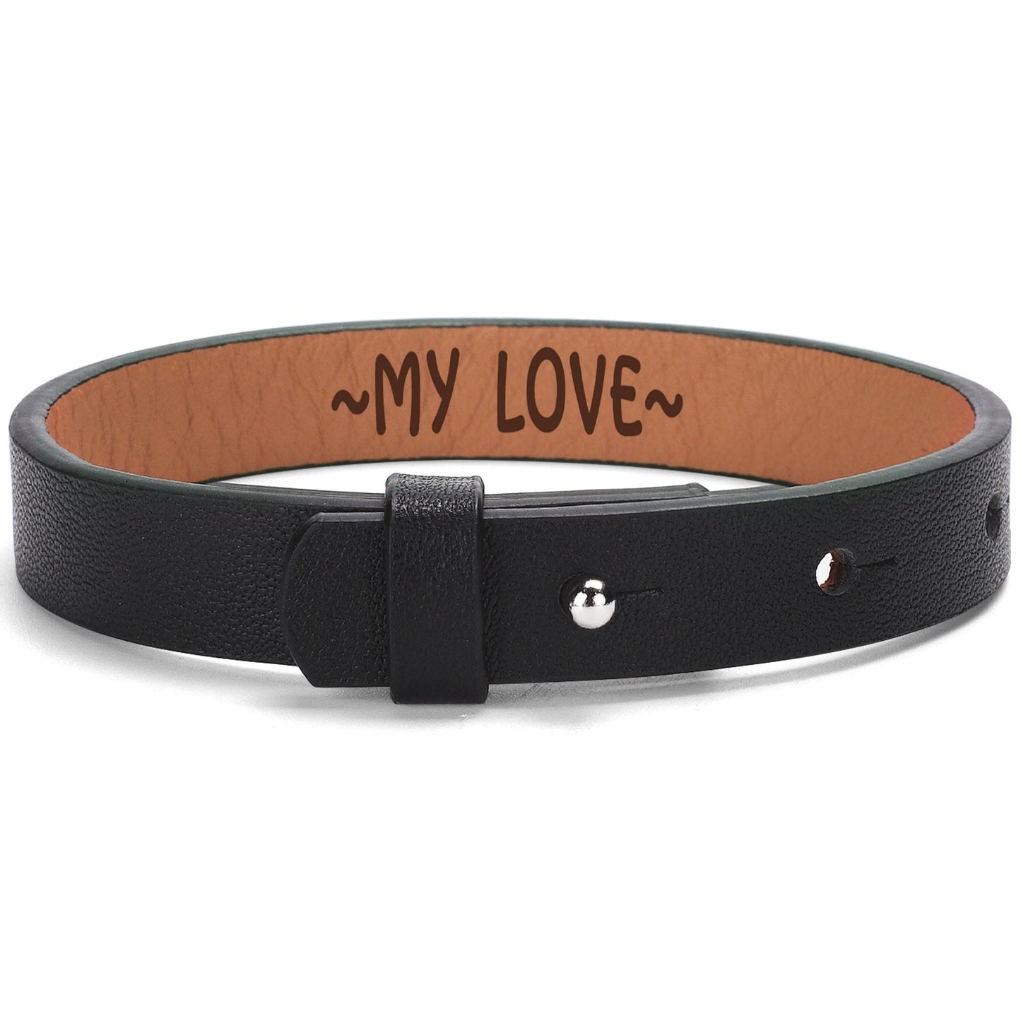 A timeless keepsake with a hidden message close to the skin—this engraved leather cuff bracelet is a quiet reminder of love, memories, or words that matter most. Classic black leather, engraved on the inside for privacy and sentiment, makes this piece deeply personal and incredibly wearable.
