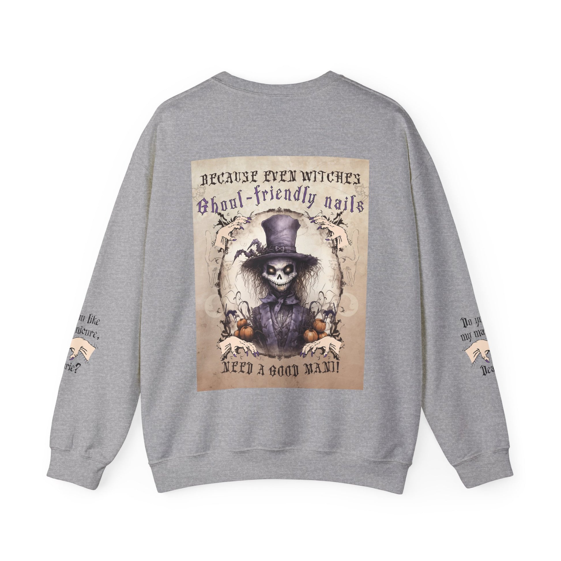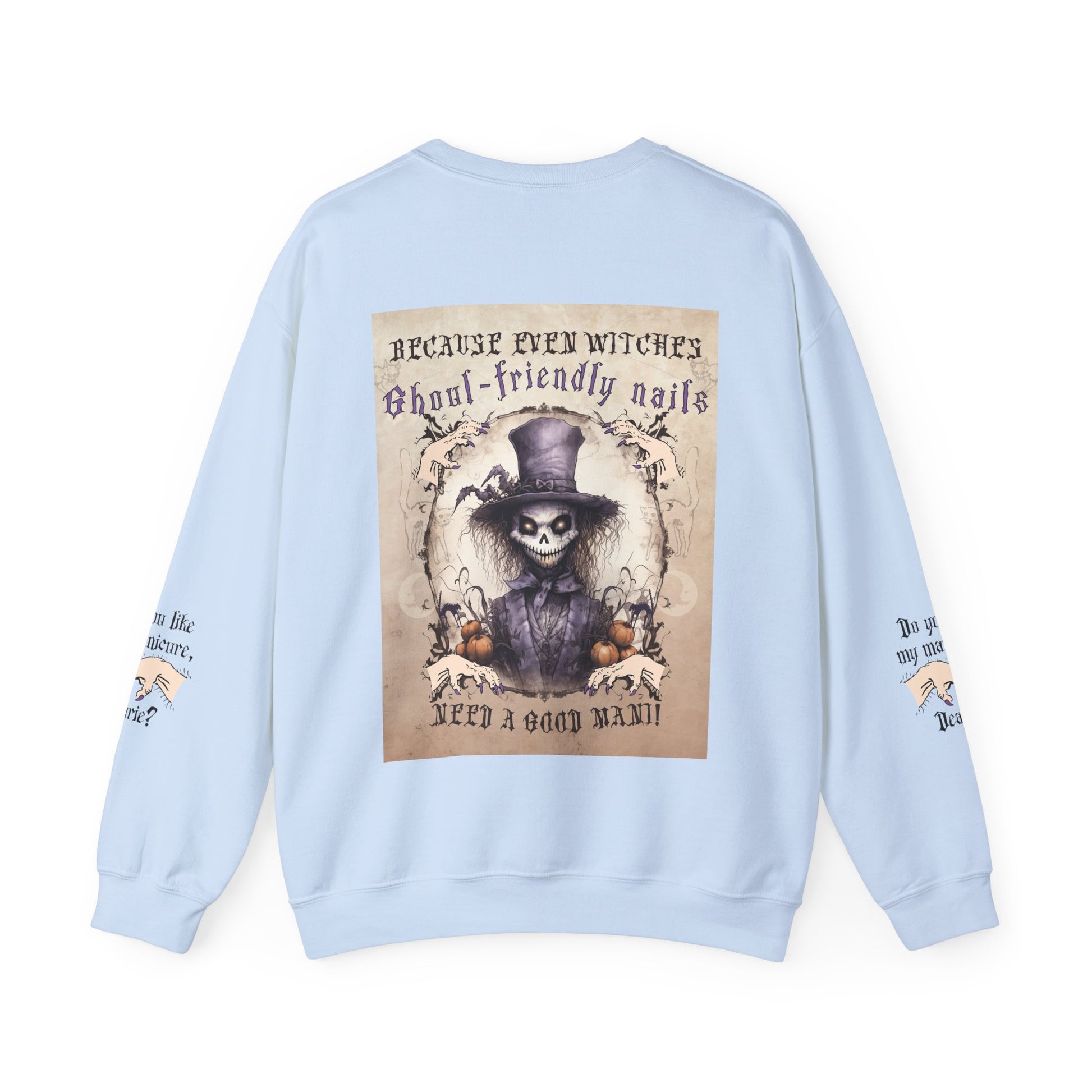 Introducing our 'Ghoul-Friendly Nails' Manicurist Sweatshirt – a bewitching fusion of nail artistry, Halloween charm, and a whimsical scarecrow style, perfect for keeping cozy and showcasing your enchanting nail salon spirit this spooky season!