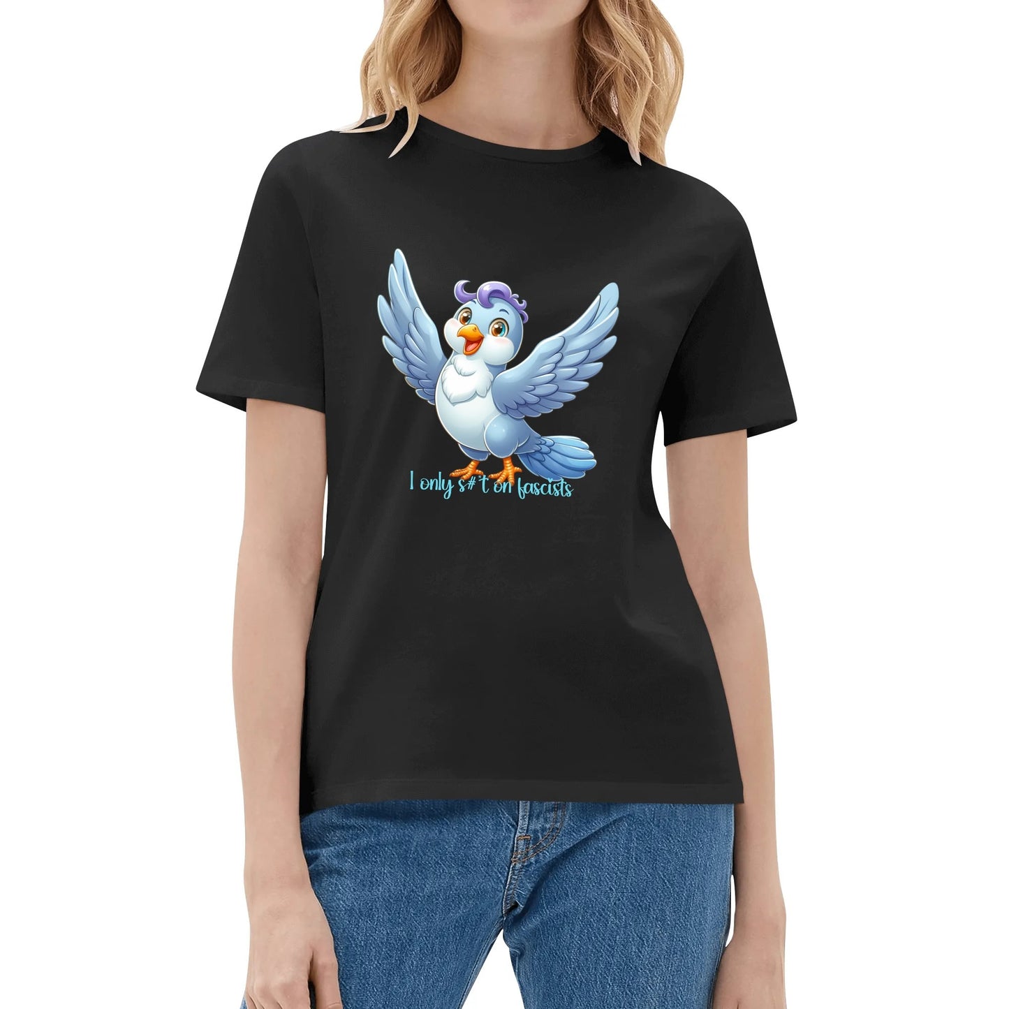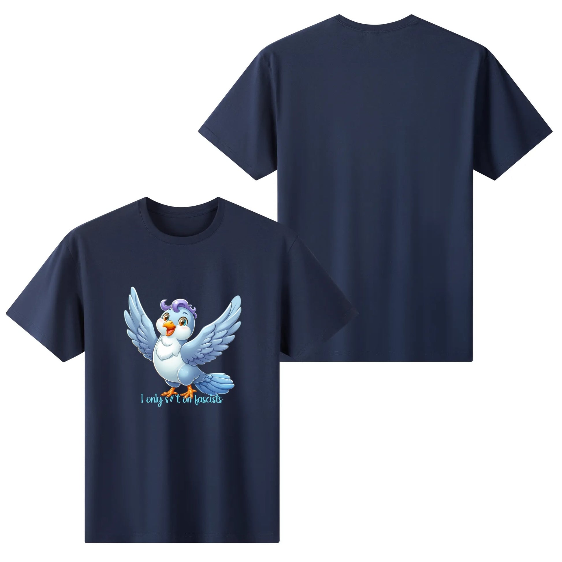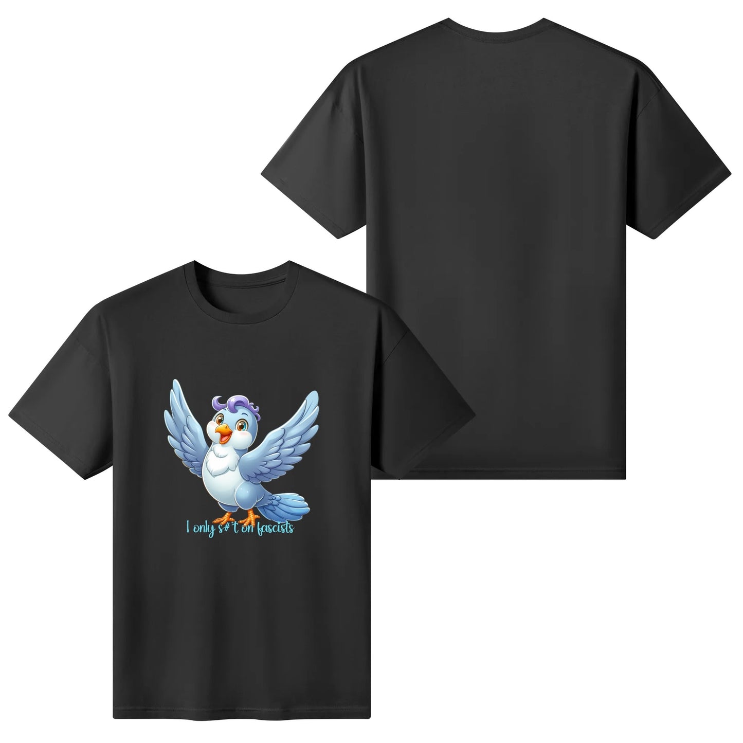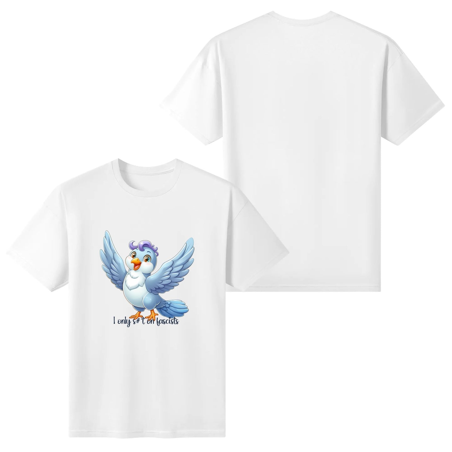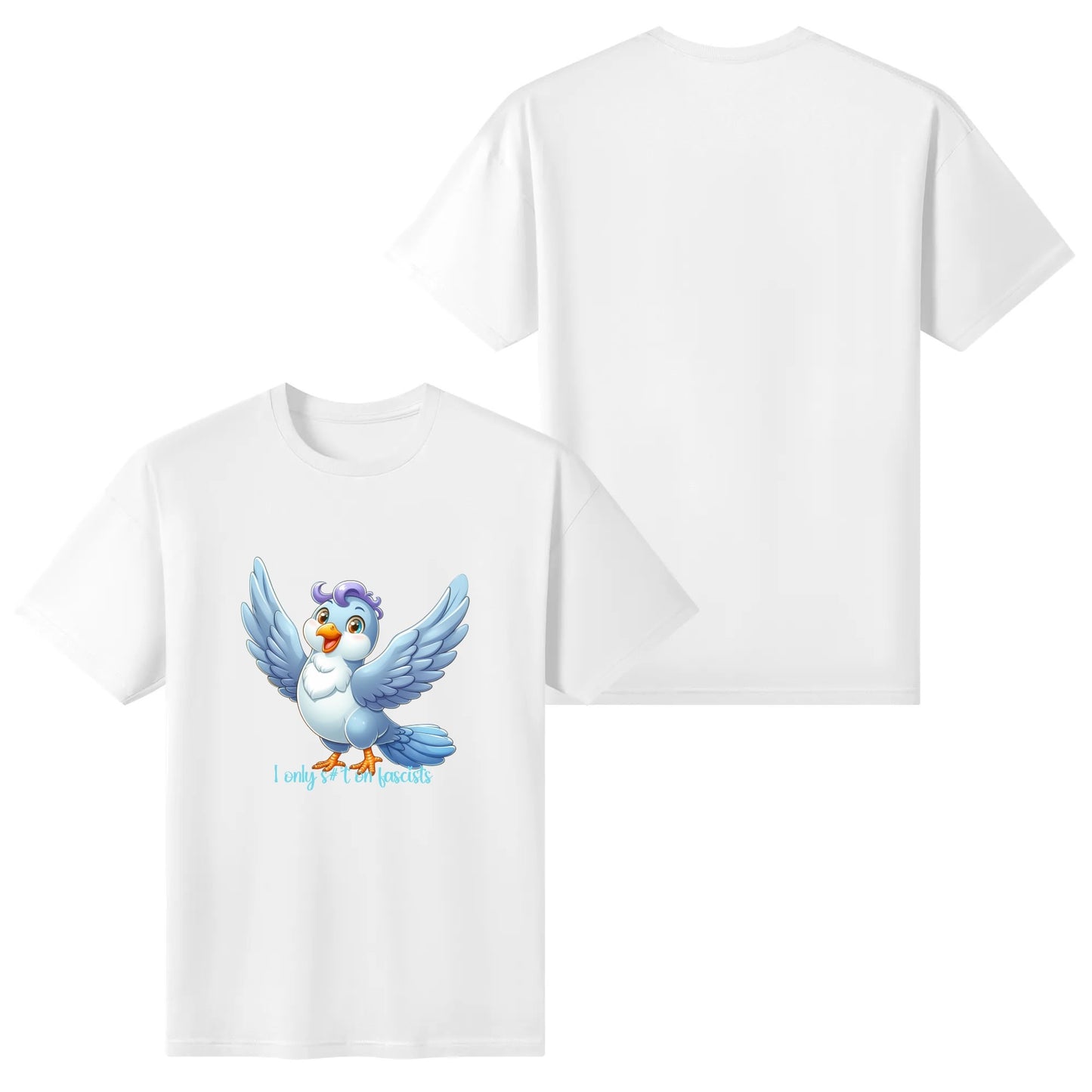 This wide-eyed little rebel might look innocent, but it’s got a mission: target fascism with zero tolerance and sharp aim. Bold, cheeky, and oddly uplifting, this design is for those who believe in freedom… and well-aimed droppings.