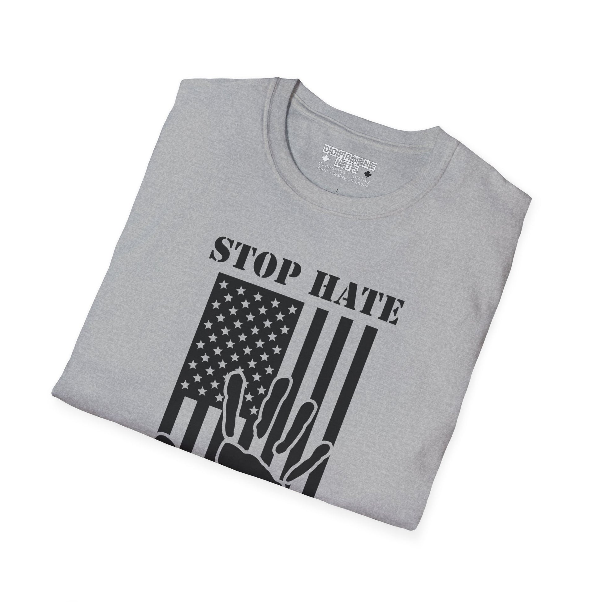 Make your message unmistakable. This unisex soft-style tee pairs everyday comfort with a bold call for unity. Featuring the STOP HATE headline and a striking flag-and-hand graphic, it’s a quiet protest piece that still speaks loudly.